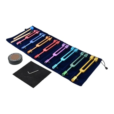 Complete Chakra Frequency Set: This professional chakra tuning fork kit includes 8 precisely calibrated frequencies (126.22Hz–272.2Hz), each targeting specific energy centers for holistic healing. Ideal for balancing root to crown chakras, reducing stress, and enhancing spiritual practices like meditation or Reiki. Premium Construction: Crafted from aircraft-grade aluminium alloy, these forks are corrosion-resistant, non-magnetic, and ultra-durable. The weighted fork heads ensure crystal-clear tones with extended vibrations (up to 25 seconds) for accurate therapeutic sessions. Multi-Purpose Healing Companion: Designed for therapists and wellness practitioners, this set effectively addresses: Musculoskeletal pain & scar tissue reduction, relief and nervous system balance, sound therapy workshops or yoga/meditation rituals. Gift-Ready Packaging: Presented in a handcrafted wooden gift box with silicone activators and cleaning cloth, this set makes an elegant gift for health professionals or spiritual seekers. Perfect for birthdays, graduations, or self-care milestones. What You Get: 8 x Chakra tuning forks(126.22, 136.1, 141.27, 172.06, 194.18, 210.42, 221.23, 272.2Hz) , 1 x activator, 2 x silicone hammer, 1 x storage bag, 1 x cleaning cloth. Should you have any queries, we shall be delighted to assist you, ensuring you enjoy a swift and effortless healing experience.
