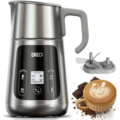 Microfoam must be poured within 30s after frothing is finished to create latte art 𝐔𝐥𝐭𝐢𝐦𝐚𝐭𝐞 𝐀𝐥𝐥-𝐢𝐧-𝟏 𝐅𝐫𝐨𝐭𝐡𝐞𝐫: Make 30+ drinks like flat-white, cappuccino, rich hot chocolate with Dreo BaristaMaker milk frother – a versatile 3-in-1 device as milk frother, stirrer, and 𝐜𝐡𝐨𝐜𝐨𝐥𝐚𝐭𝐞 𝐦𝐚𝐤𝐞𝐫. It offers 3 microfoam options (thin/medium/thick) for latte art, 2 thick foams (hot/cold), and its stir mode excels at powder-based drinks (protein shakes, chocolate milk) while crafting smooth, indulgent hot chocolate directly. 𝐑𝐢𝐜𝐡 𝐅𝐥𝐚𝐯𝐨𝐫𝐟𝐮𝐥 𝐌𝐢𝐥𝐤 𝐅𝐨𝐚𝐦 Take flavor to a new level thanks to DREO's multi-stage technology, it replicates the steps taken by professional baristas, balances 65℃ temperature and air blending without diluting the milk, resulting in a wonderful taste. 𝟔 𝐌𝐢𝐥𝐤 𝐓𝐲𝐩𝐞𝐬, 𝐋𝐚𝐫𝐠𝐞 𝐂𝐚𝐩𝐚𝐜𝐢𝐭𝐲: This milk frother has 6 programs for all dairy and plant-based options (including 1.whole 2.half-half 3.almond 4.coconut 5.soy 6.oat milk ) and an extra large 27oz jug has 4 types of capacity scales 𝐏𝐞𝐫𝐟𝐞𝐜𝐭 𝐅𝐫𝐨𝐭𝐡𝐢𝐧𝐠 𝐂𝐨𝐦𝐩𝐚𝐧𝐢𝐨𝐧: Anti-scorching milk,dishwasher Safe, easy to clean, quiet operation, LED display. This electric milk frother designed with stainless steel body and anti-scorch function. Plus it works incredibly quiet at only 60dB. 𝐖𝐨𝐫𝐥𝐝-𝐜𝐥𝐚𝐬𝐬 𝐋𝐚𝐭𝐭𝐞-𝐀𝐫𝐭 𝐅𝐫𝐨𝐭𝐡𝐢𝐧𝐠: Make art out of coffee thanks to DREO's impeller tip and micro-level screen breaks down bubbles into 0.5mm microfoam(50% finer than usual standards).The pitcher design of BaristaMaker makes creating latte art a breeze., Weight: 2.75 Pounds, Manufacturer: Dreo