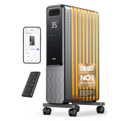 𝟑𝟔𝟎° 𝐖𝐡𝐨𝐥𝐞-𝐇𝐨𝐦𝐞 𝐖𝐚𝐫𝐦𝐭𝐡: Dreo oil filled radiator heater delivers swift and silent heating at 2000W, boosting efficiency by 83.3%. Its 9 advanced fins outpace competitors by 39.49% in heat dispersion. Stay cozy with rapid, quiet, and even warmth. 𝐏𝐞𝐚𝐜𝐞𝐟𝐮𝐥 𝐒𝐚𝐟𝐞𝐭𝐲: Dreo oil filled heater ensures peace of mind with triple overheat protection, fire-resistant materia. Tilt protection, burn-proof plug, and 7-layer safety checks secure your haven. 𝐏𝐞𝐫𝐬𝐨𝐧𝐚𝐥𝐢𝐳𝐞𝐝 𝐂𝐨𝐦𝐟𝐨𝐫𝐭: Set your ideal temperature with eco mode. Dreo's precise sensor and smart algorithms maintain steady warmth, eliminating temperature fluctuations. Enjoy your comfort wherever you are in, like bedroom, office or living room. 𝐄𝐧𝐞𝐫𝐠𝐲 𝐄𝐟𝐟𝐢𝐜𝐢𝐞𝐧𝐜𝐲: Choose from 800W/1200W/2000W modes, plus eco mode for tailored power use. Dreo electric heater optimizes real-time energy consumption, saving on bills and resources. 𝐔𝐬𝐞𝐫-𝐅𝐫𝐢𝐞𝐧𝐝𝐥𝐲 𝐃𝐞𝐬𝐢𝐠𝐧: Navigate with ease using the large LED display, touchscreen, or remote control. Dreo glides effortlessly with large wheels and handles for room-to-room warmth. Child lock, mute, and screen-off modes cater to home use. With a 24-hour timer, Dreo radiant heater welcomes you with pre-heated comfort. 𝐒𝐞𝐚𝐦𝐥𝐞𝐬𝐬 𝐒𝐦𝐚𝐫𝐭 𝐂𝐨𝐧𝐭𝐫𝐨𝐥: Tweak all your heating settings from anywhere with the DREO app or using voice commands thanks to Google and Alexa assistant support. You can also monitor your room temp and control timers within the DREO app making your heating experience more convenient and easy!, Weight: 21.5171167712 Pounds, Manufacturer: Dreo