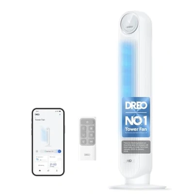 Smart Fan Control: Forgot to turn-off the fan before leaving. Control your fan from anywhere with your smartphone. The Dreo App gives access to all Dreo devices at once from any room or even while you are away. Take convenience to the next level with the new voice command powered by Alexa and Google assistant. Powerful Meets Portable: Dreo's all-in-one airflow system combines with a supercharged electric motor, delivering high-speed, brisk cool. This 36-inch compact tower fan exhilarates every inch of air in your living space moving air up to 25ft/s. Cut Out the Noise: Enjoy all-day serenity and comfort, enabled by its algorithmic impeller design and the magical Conada effect. Go in unison with the display auto off, and auto mute in Sleep mode with an 8h timer, and soothing airflow, all precisely engineered to allow for a restful sleep whenever you need it. Easy to Clean & Safe to Use: Removable rear grille and the impeller wheel make cleaning more accessible. Designed with fingertip pinch-proof grills, a fused plug and built-in circuit protection, this UKCA-listed bladeless fan ensures safety is always prioritized. Far and Vast: 90° oscillation and calibrated airflow path allow this oscillating fan to cover more areas in the room. Combine with your cooling air conditioner and cut the extra cooling costs during hot days. Customizable Comfort: Featured with 4 modes (Normal/Natural/Sleep/Auto) and 4 speeds from soothing-soft to storm-strong, you can easily customize your comfort at the touch of a button, on the panel or the remote. Fit Anywhere: With a compact design and a hidden handle, you can easily store the remote in the built-in compartment and carry this slim fan to your bedroom, living room or elsewhere. A perfect choice for home and office., Weight: 9.0 pounds, Manufacturer: Dreo