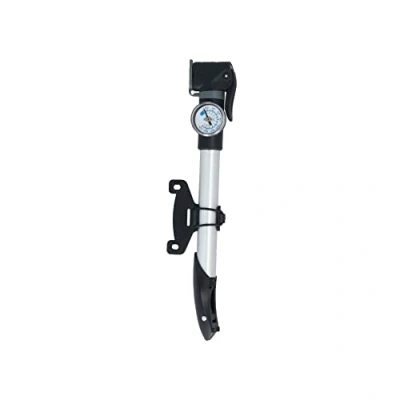 Mini pump with pressure gauge and double plastic pump head Suitable for all types of bicycle valves Pump range up to 5.5 bar/80 psi