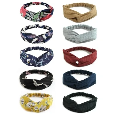 DRESHOW 10 Pack Boho Headbands for Women Vintage Flower Printed Criss Cross Knotted Elastic Hair Band Stretchy Head Wrap Twisted Cute Accessories