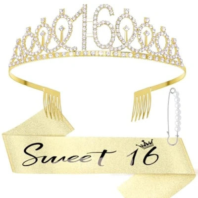DRESHOW 16th Birthday Crown and Sash for Women Girls & Rhinestone Tiara Set Hair Accessories Party