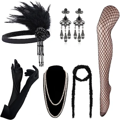 Flapper Headband: adorned with feather and jewel, one size fits most heads, attached to a black elastic band that allows for easy adjustment. Unique vintage satin gloves, timeless classic faux pearl necklace, retro-style Dangle earrings,soft fluffy feather boa, and charming fishnet pantyhose, all these bead & feather Gatsby accessories are perfect for a 20s party. A wonderful accessory set for prom, great gatsby party, roaring 20s themed party, Hollywood glam ball, Halloween dress-up party, 1920's murder mystery party, etc. Stunning vintage styling right off the 1920s Gatsby runway! A set of most popular items for great flapper girls look. Go back to your roaring 20s with the fabulous flapper costume accessories, making you unique and eye-catching! Package contents are all shown in the picutre
