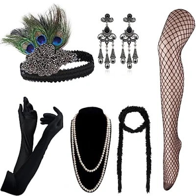Flapper Headband: adorned with feather and jewel, one size fits most heads, attached to a black elastic band that allows for easy adjustment. Unique vintage satin gloves, timeless classic faux pearl necklace, retro-style Dangle earrings,soft fluffy feather boa, and charming fishnet pantyhose, all these bead & feather Gatsby accessories are perfect for a 20s party. A wonderful accessory set for prom, great gatsby party, roaring 20s themed party, Hollywood glam ball, Halloween dress-up party, 1920's murder mystery party, etc. Stunning vintage styling right off the 1920s Gatsby runway! A set of most popular items for great flapper girls look. Go back to your roaring 20s with the fabulous flapper costume accessories, making you unique and eye-catching! Package: 6 pieces set including feather headband, gloves, pearl necklace, earrings, feather boa, fishnet tights.