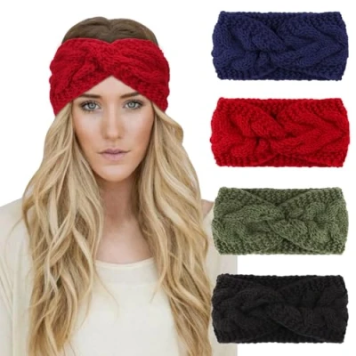 DRESHOW 4 Pack Crochet Knit Turban Headband Warm Bulky Crocheted Head Wrap Ear Warmer for Women