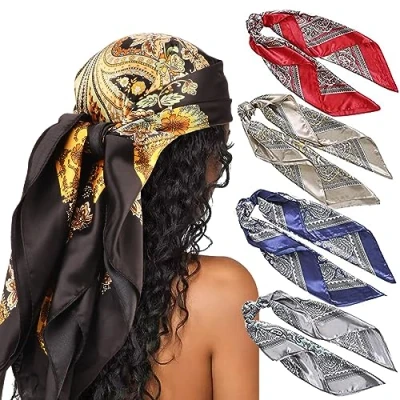DRESHOW 4 Pack Large Square Satin Headscarves Hair Scarves Silk Accessories Beach Bandanas for Women