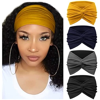 GOOD and bad hair days how to wear them? These hairbands are comfortable and versatile, without getting a headache from plastic ones. STRETCHY: Our wide headbands have good elasticity, won’t be too loose or tight, and feel no pressure on your head. Comfortable and tender to wear, perfect to gently secure your messy hair. MATERIAL: 95% Polyester, 5% Spandex to keep fabric stretchy. Easy care, machine washable and lay flat to dry, providing the excellent performance of absorbency, wicking, durability, and abrasion resistance. SIZE & PACKAGE: Girth 17", wide 3"- 4.5", length 9.4" can be stretched up to 12" which proper to most ladies' head circumferences. 4 Pcs turban headbands in your parcel! OCCASION: Perfect for wearing in daily life like makeup, washing face, doing housework, and playing sports like yoga, workout, Pilates, running, hiking, travel, etc.