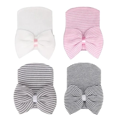 DRESHOW 4 Pcs Newborn Hospital Hat Infant Baby Cap with Big Bow Soft Cute Knot Nursery Beanie