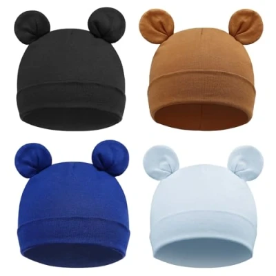 DRESHOW 4 Pieces Baby Beanie Newborn Toddler Soft Cute Knit Hat Hospital Hats for Boys Bear Ears Infant