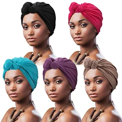DRESHOW 5 Pack Women Turban African Pattern Knot Headwrap Beanie Pre Tied Bonnet Chemo Cap Hair Loss Hat