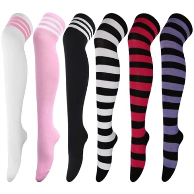 Size: the length from top heel is about 68cm, and toe to heel is about 18cm; with good elasticity, and the maximum circumference of the socks can be stretched to about 38cm; our model has a calf circumference of 28cm and a thigh circumference of 36cm and she feels comfortable and not tight; if you have any other questions, please contact us and we will reply you as soon as possible Our knee high socks are made from soft and comfortable poly-cotton blends, which is breathable and comfortable. They have good elasticity and will not fall down. can be matched with most clothes, suitable for daily wearing, cosplay, dancing and yoga; ideal gifts to send to girls and women Wide range of wearing ways: put them over your knees to keep your knees warm; wear them below your knees and over your calves to have a faddish feeling; you can also push down the thigh-high length tube socks around the ankles as popular loose socks Super cute with shorts and mini skirts, which show your youthful vigor and spike your confidence. You can also wear them under the knees as piles of socks, natural and casual; 6 different styles, enough for many occasions and replacement Sweet, elegant and cute socks can be worn with mini skirts and shorts, comfortable and breathable, smooth and skin-friendly; suitable for wearing in 4 seasons, wearing in spring is comfortable, wearing in an air-conditioned house in summer can protect your knees, wearing in autumn is cool and beautiful, and wearing in winter can keep warm