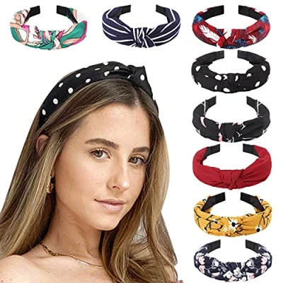 Amazon HIGH QUALITY -- Made of plastic, the adorable hair hoops are wrapped with ribbing or floral cloth, which is soft and smooth to touch. The snug touch makes it wear comfortably, won't dig into the scalp, and hurt the head. FASHION STYLE -- Fashion ribbing design to keep your wonderful looking and hairdos. The fabric crosses in front to create an adorable knotted style. Bright-colored, with no smell and no fade. GREAT DEAL -- Get 8 pieces of Wide Headbands in one package! Multi-color choices to match different minds and outfits. The turban headbands not only keep you a wonderful fashion looking but also keep your hair when washing your face or makeup! DAILY LIFE ACCESSORY -- Presenting classic ribbing fabric with a plastic headband. It's hard to imagine girls don't have a boho hairband. The Knotted headbands are pretty useful for you as a necessary daily hair accessory. They won't slip on your head and are perfect for bad hair days, exercise, the beach, backpacking, and more! IDEAL GIFT FOR HER -- Wonderful headband for yourself to wear as you like or share with your girlfriends, sisters, mother, etc. Give it as a perfect gift on birthdays, anniversaries, valentine's day, mother's day, or any other festival.