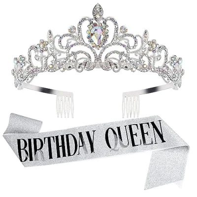DRESHOW Birthday Crown and Sash for Women Queen & Rhinestone Tiara Set Tiaras Sashes Girls Decorations Hair Accessories Glitter Party