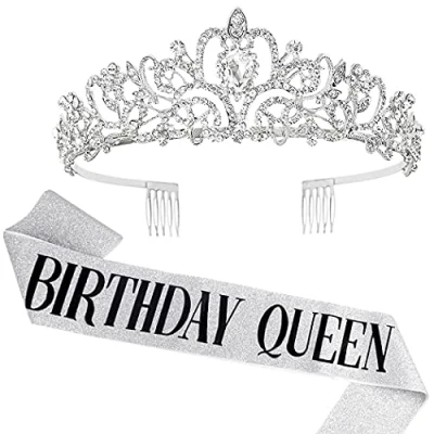 DRESHOW Birthday Crown and Sash Set Queen Rhinestone Tiara for Women Girls Party Decorations Hair Accessories with Glitter