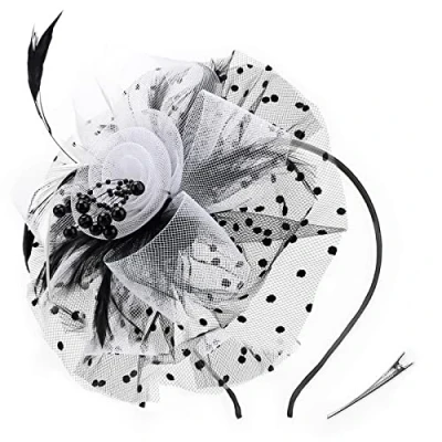 Amazon Material: This vintage glamour and fancy charming hat with its birdcage veiling and flush amount of boa feathers that cascade at the back with goose biot feathers forming ovals and that sways in the wind. Trendy style matches everything. One size fits all. Firmly secured underneath with headband and clip to hold in place and to give you the versatility to wear it any desire you like. You can style your hair like a bun and use it as a bridal flower hair clip or you can place it further towards your face and wear it as a vintage styled flower fascinator. Timeless glamour. This sassy fascinator gives a nod to vintage style with a bouncy mesh ribbon and flighty feathers. With its classic sinamay mesh shape and elegant look it will be your go-to fascinator for the season. This beautiful, timeless, classy and elegant black vintage inspired feather Fascinator hat is suitable for as a wedding Fascinator, tea party hat, Cocktail hat, black merry widow hat or any special occasion Specially Designed for Lady and Women to Look Eleegant and Pretty, Like a Beautiful Fascinator hat for a duchess to attend the royal banquet