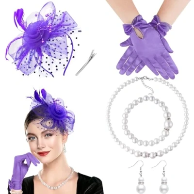 Amazon Tea Party Accessories Set: 1 pc fascinator hat with clip and headband, 1 pc faux pearl necklace, 1 pair of short gloves, 1 pc faux pearl bracelet and 1 pair of pearl earrings in the parcel, reproduction of 20s 50s styles to create a retro and attractive look. Exquisite Design: Our pillbox fascinator hat is made of mesh, beads and faux feathers featuring polka dots design, lightweight, portable and delicate. Highly stretchy short gloves are properly elasticized. The classic faux pearl necklace and bracelet are shiny and elegant, and the faux pearl drop earrings are small and vintage to embellish your beauty. Size: The vintage feather fascinator hat's mesh veil measures 9.1"/23cm in diameter, and the flower measures 7.7"/19.5cm in diameter, the necklace is about 18.8"/47.8cm in length, the gloves measures 8.7"/22cm in length, the bracelet circumference is 7.1"-10.2"/18cm-26cm, and the earrings have a length of 1.7"/4.3cm. This set fits most women girls. Perfect Costume Accessories: With a strong 1920s vintage style, the gorgeous accessories set will help you create an elegant ladylike look and makes you stand out at parties. You can also share them with your mother, sisters and friends, giving them a surprise and happiness. Occasions: This fascinators hat set for women is ideal for photography, great gatsby banquet, Derby, bridal party, wedding, church, cocktail party, tea party, 1920s party, birthday party, concert, stage show, cosplay costume, fancy dress party, Easter, Halloween dress up party or any other special occasion.