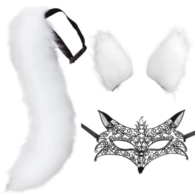 DRESHOW Faux Fur Wolf Tail Cat Ears Hair Clip Lace Masquerade Mask Set Fox Cosplay Costume Animal Dress Up Fancy Accessories Halloween Role Play Party