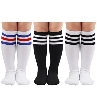 Material - These kids stripe knee high socks are crafted from quality cotton and nylon, soft, breathable, skin-friendly, and durable, comfortable to touch, No fade, no pilling. Size - Our soccer socks come in three sizes. The small size is about 28cm in length for toddlers aged 1-3 years old; the medium size is about 35cm in length for children aged 3-6 years old; and the large size is about 42cm in length for children aged 6-10 years old. Not easy to slide off, great of all-day wear. Design - Featuring with stripe pattern on the top, minimalist, classic, vintage, casual, and sporty style, easily match with various school uniforms, casual shirts, shorts, and skirts. Occasion - These soccer socks are suitable for daily wear, running, hiking, sports (playing football/, baseball/basketball, etc.), Cosplay, Halloween costume,Christmas costume, school uniform and so on. Perfect Gift - DRESHOW cotton socks are perfect for Thanksgiving, Christmas, Birthday for your son or daughter, your grandson or granddaughter, or other kids.