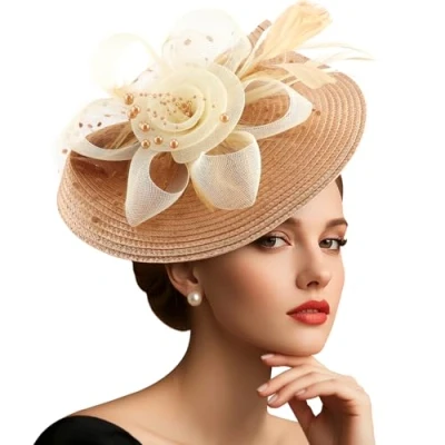 Material: This vintage glamour and fancy charming noble Kentucky hat with a straw-like hat base, the dramatic feather with netting and organza veil glamour mesh and pearl on top that sways in the wind. Trendy style matches everything. One size fits all. Design: Firmly secured underneath with headband and clip to hold in place and to give you the versatility to wear it any desire you like. You can style your hair like a bun and use it as a bridal flower hair clip or you can place it further towards your face and wear it as a vintage styled flower fascinator. Timeless glamour. This sassy fascinator gives a nod to vintage style with a bouncy mesh and flighty feathers. With its classic sinamay mesh shape and elegant look it will be your go-to fascinator for the season. Contains: removable (changeable) feather, a bunch of imitation pearls with organza Veil as the decoration part Hat on a Headband,1* Forked Clip Occasions: The high quality and timeless flower feather fascinator head is suitable for many occasions, such as Carnivals, funeral, Halloween, high tea, horse racing, festival, Victoria costume, wedding, tea party, Cocktail, 1920s Gatsby party, church, Easter, photography, costume party, bridal party, wedding and other special occasions.