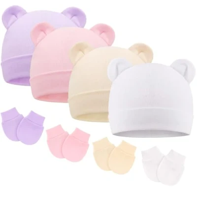 Premium Material: DRESHOW newborn baby hats and mittens are made of 96% cotton and 4% spandex, which is comfortable to touch, perfect for newborns, and won't cause discomfort or feel tight. The natural fabric is anti-allergenic, ensuring your baby's delicate skin will not be harmed. Thoughtful Design: The newborn hospital hat decorated with cute bear ears creates an adorable atmosphere and gives your baby a distinctive and pretty look. These scratch-resistant mittens have elasticized wrist cords that fit snugly around your baby's little hands and won't slip off easily. Suitable Size: Our newborn no scratch mittens and baby hats are suitable for babies aged 0-6 months. The newborn hat has good elasticity to accommodate the growth of the baby's head, and the mittens can completely cover the baby's hands, which is perfect for keeping warm and cozy for your baby's little hands. Multiple Uses: This cute infant beanie with bear ears and mitten set is lightweight and easy to carry, perfect for traveling and daily use, and makes chic clothing accessories for birthday parties, family photography, or baby christenings. Ideal Present: 4 newborn hats and 4 pairs of mittens in the package, and there are different colors for you to choose from for different matching, which is a thoughtful present for your baby, family, or friends' babies. Recommended to be hand washed for better results and no deformation.