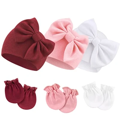 Material: our newborn baby bow hats and mittens are made of natural high-quality cotton, soft, skin-friendly, breathable, and comfortable, perfect for newborns. Size: The newborn gloves size is 8 CM x 6 CM; The hat size is W15 CM x H13 CM. Good elasticity, enough stretch to accommodate the baby's head growth. Newborn Hospital Hat: adorned with a bow to create a lovely atmosphere, the sweet baby items will highlight the cuteness of your baby and instantly lend a touch of animation. Solid color nursery caps are the best for the minimalist choice. Baby Mittens: with enough space for babies' free movement, non-scratch mittens are perfect for keeping babies' hands away from the face to eliminate any possibility of their tiny fingernail scratches while also keeping hands warm. Pack: 3 newborn hats and 3 pair mittens. For baby girls/ boys 0-6 months.Great for all seasons. It is recommended to wash by hand for better effect without any deformation!