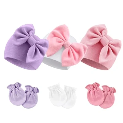 Amazon Material: our newborn baby bow hats and mittens are made of natural high-quality cotton, soft, skin-friendly, breathable, and comfortable, perfect for newborns. Size: The newborn gloves size is 8 CM x 6 CM; The hat size is W15 CM x H13 CM. Good elasticity, enough stretch to accommodate the baby's head growth. Newborn Hospital Hat: adorned with a bow to create a lovely atmosphere, the sweet baby items will highlight the cuteness of your baby and instantly lend a touch of animation. Solid color nursery caps are the best for the minimalist choice. Baby Mittens: with enough space for babies' free movement, non-scratch mittens are perfect for keeping babies' hands away from the face to eliminate any possibility of their tiny fingernail scratches while also keeping hands warm. Pack: 3 newborn hats and 3 pair mittens. For baby girls/ boys 0-6 months.Great for all seasons. It is recommended to wash by hand for better effect without any deformation!