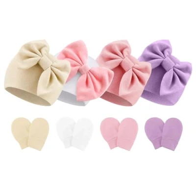 Material: our newborn baby bow hats and mittens are made of natural high-quality cotton, soft, skin-friendly, breathable, and comfortable, perfect for newborns. Size: The newborn gloves size is 8 CM x 6 CM; The hat size is W15 CM x H13 CM. Good elasticity, enough stretch to accommodate the baby's head growth. Newborn Hospital Hat: adorned with a bow to create a lovely atmosphere, the sweet baby items will highlight the cuteness of your baby and instantly lend a touch of animation. Solid color nursery caps are the best for the minimalist choice. Baby Mittens: with enough space for babies' free movement, non-scratch mittens are perfect for keeping babies' hands away from the face to eliminate any possibility of their tiny fingernail scratches while also keeping hands warm. Pack: 4 newborn hats and 4 pair mittens. For baby girls/ boys 0-6 months.Great for all seasons. It is recommended to wash by hand for better effect without any deformation!