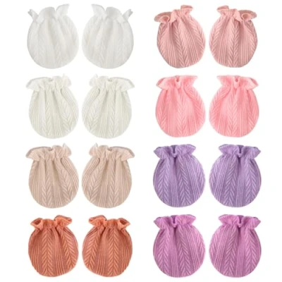 PACKAGE QUANTITY: You will get 8 pairs of newborn baby mittens in different colors, which are easy to match and offer enough quantity for daily replacement and daily wear, you can also share the cotton mittens with the babies of your friends and family. ORGANIC CERTIFIED COTTON: Our baby mittens 0-6 months are crafted from 100% Cotton! Luxuriously soft newborn mittens for utmost comfort. Infant mittens are made from the finest organic fabrics that your baby deserves. THOUGHTFUL DESIGN: The wrist part of the cotton gloves is elastic, making them easy to put on and take off, keeping the gloves stayed tightly on the baby's small hands and fitting snugly to keep the baby from self scratching. VARIETY: Available in different colors, the colors are suitable to the baby's gender or the buyer's preference. WIDELY APPLICABLE: These infant toddler gloves can be worn for various occasions, such as baby showers, birthday parties, walking, home, backyard, family gathering, playing even sleeping, and they can also be applied as lovely photo props to help you take memorable photos for your kids.