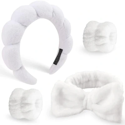 Amazon Soft and Cozy: The bow headband and wristbands are made of coral fleece, the cloud headband is made of elastic sponge lining and terry fabric, soft and skin-friendly, highly absorbent, and very comfortable to wear. High quality fabrics allow for washing and reuse. Suitable Size: The bubble skincare set is very elastic, and the makeup headband can be freely adjusted in size by stretching, easily fit your skin perfectly, and the headband has strong anti-slip properties and won't slip off easily, and won't lead pressure on the head, suitable for most people. Cute and Stylish: Our skin care headband and face wash wristband set are cute and fashionable, and will keep your hair or sleeves from getting wet while you wash your face or put on makeup. The cloud edge design of the headband and the big bow on hair band is unique and versatile, and it also slims down your face shape, making you more charming. Wide Application: This headband & hairband for washing face and face washing wristband set is suitable for daily hair accessories, face wash, bath, spa, cosmetology, skin care, makeup, beauty salon care, etc. It allowing you to always stay beautiful in your daily life. Package List: The headbands for women set contains 1 pcs headband, 1 pcs hair tie and 2 pcs wristbands. You can give them to your girlfriend, mother, daughter and any other women and girls. It is also a great choice for birthday parties, anniversaries, Valentine's Day, Mother's Day, Christmas, Halloween and other holidays.