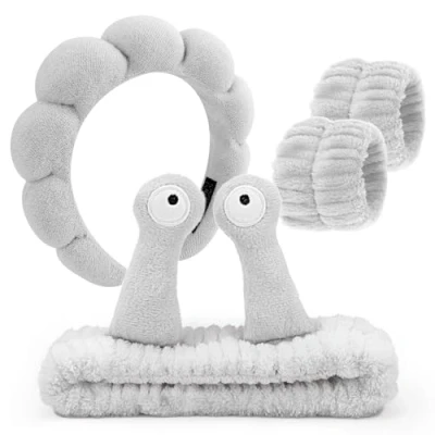 Amazon Soft and Cozy: The Snail Shape headband and wristbands are made of coral fleece, the cloud headband is made of elastic sponge lining and terry fabric, soft and skin-friendly, highly absorbent, and very comfortable to wear. High quality fabrics allow for washing and reuse. Suitable Size: The bubble skincare set is very elastic, and the makeup headband can be freely adjusted in size by stretching, easily fit your skin perfectly, and the headband has strong anti-slip properties and won't slip off easily, and won't lead pressure on the head, suitable for most people. Cute and Stylish: Our skin care headband and face wash wristband set are cute and fashionable, and will keep your hair or sleeves from getting wet while you wash your face or put on makeup. The cloud edge design of the headband and the big snail shape on hair band is unique and versatile, and it also slims down your face shape, making you more charming. Wide Application: This headband & hairband for washing face and face washing wristband set is suitable for daily hair accessories, face wash, bath, spa, cosmetology, skin care, makeup, beauty salon care, etc. It allowing you to always stay beautiful in your daily life. Package List: The headbands for women set contains 1 pcs headband, 1 pcs hair tie and 2 pcs wristbands. You can give them to your girlfriend, mother, daughter and any other women and girls. It is also a great choice for birthday parties, anniversaries, Valentine's Day, Mother's Day, Christmas, Halloween and other holidays.