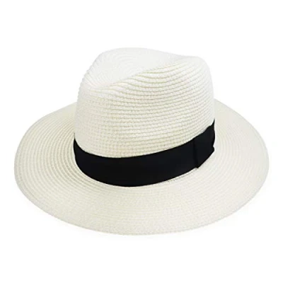 DRESHOW Women Straw Panama Hat Fedora Beach Sun Wide Brim Roll up UPF 50+, Ivory V2