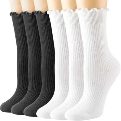 DRESHOW Womens Ruffle Socks Cotton Turn Cuff Casual Ankle Breathable Lettuce Crew Knit Frilly Sock 6 Pack