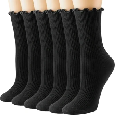 DRESHOW Womens Ruffle Socks Cotton Turn Cuff Casual Ankle Breathable Lettuce Crew Knit Frilly Sock 6 Pack