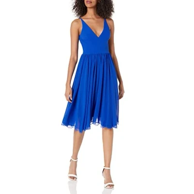 Dress the Population Women's Alicia Sleeveless Plunging Fit and Flare Midi Dress, Electric Blue, L