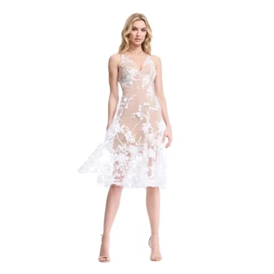 Dress the Population Women's Audrey Spaghetti Strap Midi A line 3D Floral Special Occasion, White/Nude, M