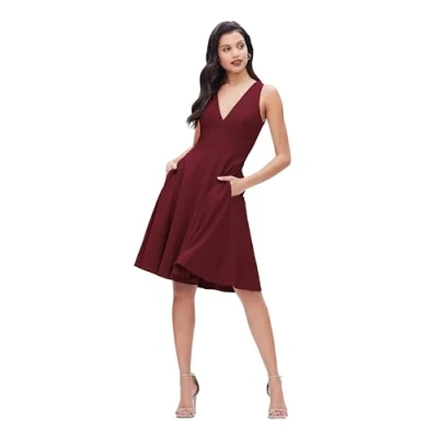 Dress the Population Women's Catalina Solid Sleeveless FIT & Flare MIDI Dress, Burgundy, S