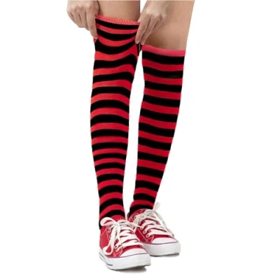 CLASSIC BLACK AND RED STRIPES: Our black and red striped socks feature a timeless and versatile design that adds a touch of sophistication to any outfit. Whether you’re dressing up or down, these stylish stripes are sure to make a statement. VERSATILE STRIPED SOCKS: These black and red knee high socks are perfect for any occasion. The bold black and red stripes complement both casual and formal attire, making them an essential addition to your wardrobe. Pair them with jeans, chinos, or even a suit for a chic look. SUPERIOR COMFORT AND QUALITY: Made from a premium blend of soft cotton, durable polyester, and a hint of spandex, our white and black socks provide an exceptionally comfortable fit. The breathable fabric ensures your feet stay cool and dry all day long, while the stretchy material offers a snug, non-slip fit. DURABLE AND LONG-LASTING: Designed to withstand everyday wear, black and red knee high socks are crafted with reinforced toes and heels for added durability. The high-quality construction prevents wear and tear, ensuring these socks maintain their shape and vibrant pattern even after multiple washes. EASY MAINTENANCE: These striped thigh high socks are machine washable and retain their bold black and red stripes wash after wash. They are also resistant to fading and shrinking, making them easy to care for and a practical choice for your daily wardrobe., Manufacturer: Dress Up America