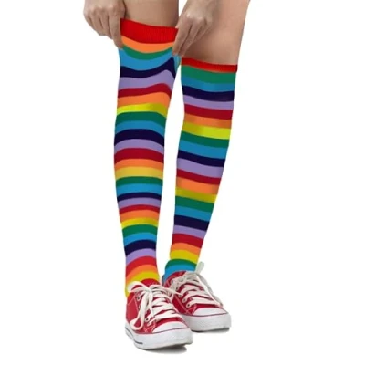 AmazonVIBRANT COLORS: Our colorful striped socks are designed with bold colors that stand out. Perfect for boys and girls, these socks add a touch of brightness to any outfit, making them ideal for Halloween, Sports, or everyday wear. COMFORTABLE AND DURABLE: Made from high-quality materials, these striped knee high socks are both comfortable and durable. They provide a snug fit that stays in place, making them perfect for active kids who love to run, play, and explore. FUN AND PLAYFUL DESIGN: Featuring bold colorful stripes, these socks are not only functional but also fun and playful. They can be worn with casual outfits or as part of a whimsical costume, adding a pop of color and style to any ensemble. PERFECT FOR COSTUMES: Our rainbow striped socks are a must-have for any costume collection. Ideal for Halloween, they can transform your child into an fun costume, adding the perfect finishing touch to any outfit. EASY CARE: These striped socks are machine washable and maintain their vibrant stripes even after multiple washes. They are easy to care for and retain their shape and color, making them a practical addition to your wardrobe., Manufacturer: Dress Up America