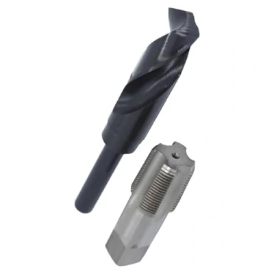 Carbon steel pipe taps are designed to clean and or re-thread damaged or Jam pipe threads Black oxide drill bit is ideal for production, maintenance or portable drilling jobs 3/4" carbon steel NPT tap and 59/64" HSS drill bit with 1/2" Shank Set comes in plastic pouch Set contains matching NPT pipe tap and high speed steel drill bit