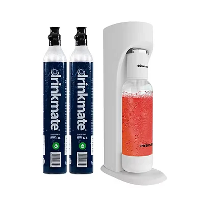 DrinkMate OmniFizz Sparkling Water and Soda Carbonator, Sparkles Any Drink, Includes 1L Re usable BPA Free Carbonating Bottle, Two 60L CO2 Cylinders Patented Fizz Infuser (Classic White)
