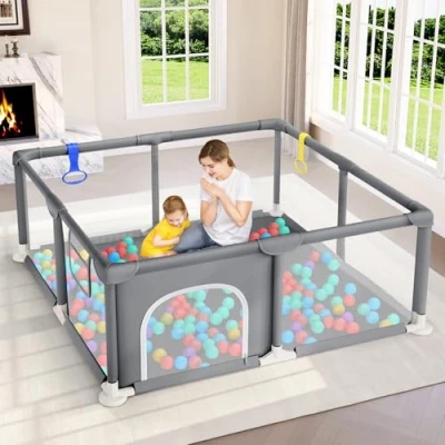 【Special Gift Ideas】Dripex baby playpen is a versatile gift for all ages that not only provides a safe and fun baby activity centre for your little ones but also reduces the stress of caregivers such as parents or grandparents not having to chase kids around, giving them some free time to relax, so it's a double benefit 【Baby Safety Guardian】Dripex playpen for baby and toddlers is made of high-quality washable 210D Oxford cloth. It is more abrasion, tear, and stain resistant than 150D Oxford cloth, which most brands use. The play pen is tightly stitched and fully lined with a padded fabric filled with soft cotton. It eliminates the risk of pinching and head bumps 【Relieves Parents】When doing housework, you can place baby in the playpens in peace. See-through mesh provides you with 360° full-view, so you can keep an eye on babies at all times. The zippered door of the play pen babies and toddlers can only be opened from outside. So, a visible baby pen is also a thoughtful gift for parents who don't have to worry about baby getting out 【Help Baby Grow Better】The baby play pen gives your baby plenty of play space to practice crawling, standing, walking, running, and other movements. The included colorful pull ring not only helps your baby build arm strength but also helps them have more fun while learning to stand 【Easy To Install & Clean】The Dripex baby playpen is designed as a square, so all the steel tubes are the same length. No need to struggle to recognize. You can install it in less than 30 minutes with no tools. Installation has never been easier! Beaises, Dripex baby play pen is made of washable Oxford fabric, you can easily clean milk and urine stains with a damp cloth and soap 【Wide Applicability】Dripex baby playpen fits different sizes of homes. You can put it in the living room, bedroom, children's room, etc. As 1-5 year old boy and girls gift, our playpen for baby and toddlers is big enough for your little one to store toys, crawl, walk, play, and read. NOTE: There is no ocean ball in the baby play pen