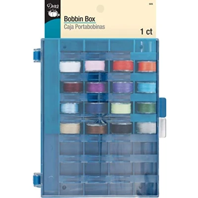 Sturdy plastic bobbin box with latched lid Clear lid allows you to see all thread colors Holds 32 machine bobbins (bobbins/thread not included)