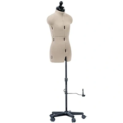 12 soft-grip rolling wheels adjust dress form precisely allowing you to customize the form to match your bust, waist, and hip measurements Decorative, wood finial adjusts neck size, plus built-in pin cushion for easy pin access and storage Easy access knob at neck turns to expand waist and hip area adding up to 2 inches of additional length Extended shoulders assist with the support and setting in of sleeves on blouses, tops, shirt, and jackets Side pole placement accommodates straight hanging of pants legs; shaped hips, crotch and thigh areas support the design and fitting of pants Expandable metal pole allows customization of dress form height to match your shoulder to floor length measurement, plus printed pole measurements and an adjustable 360-degree hem marker Rolling base provides easy movement around sewing workspace and 5 locking casters provide stationary stability Neutral fabric with cotton/polyester foam-backed cover for easy pinning and marking when draping and designing *Dress sizes are approximate ranges. For the most accurate selection, we recommend using body measurements to determine the correct dress form size.