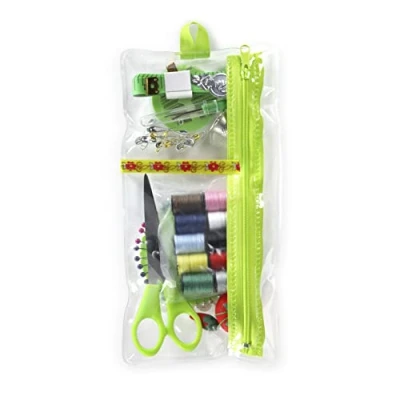 Ideal traveling companion for both sewers and beginners Includes: Pins, Pin Cushion, Scissors, Seam Ripper, 60" Tape Measure, Thimble, Safety Pins, Needles, Needle Threader, Buttons, Thread spools, Reusable Pouch, Manufacturer: Prym Consumer