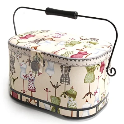 Oval shape, Assorted fabrics and colors Color-coordinated handle, trim and lining, Metal handle with black wood trim Magnetic snap closur Pocket and pin cushion attached on inside lid Includes lift-out tray for organizing small sewing items