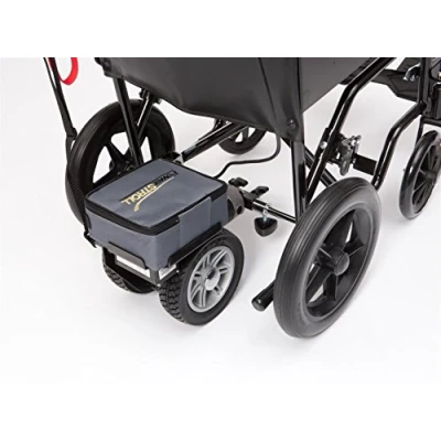 This lightweight powerstroll is easily fitted and will turn most manual wheelchairs into a carer controlled wheelchair. Maximum Gradient : 6 degree Fits most wheelchairs with seat widths from 14" to 20" (including narrow track wheelchairs). Maximum range 10 miles and top speed is 3mph. Total Weight is 14kg Uses exisiting wheelchair handgrips. Trigger handset with variable speed dial and directon button. Removeable fabric battery pack. Lightweight at 14kg and less than 8 kg with battery pack removed. Twin 'Drive' wheels with 8" black non-marking PU tyres Maximum user weight capacity 18 stone /115kg. Maximum gradient six degrees.