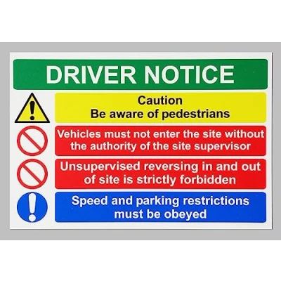 Driver notice caution beware of pedestrians speed and parking restrictions must be obeyed safety sign. 1mm flexible Plastic sign. Digitally printed for extra durability. Drill and screw in position or use double sided tape to mount onto suitable surface. All signs come with a 5-year warranty. All our signs are UV resistant meaning they will not fade in sunlight. Suitable for indoor & outdoor use.