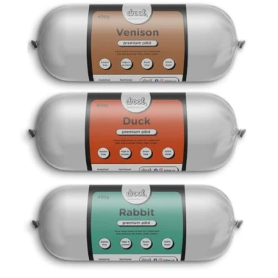 All Natural Goodness: Drool’s dog food pate is made from 100% natural ingredients with no additives or fillers — a healthy, wholesome choice for your pet. Delicious Variety: This dog pate roll pack includes venison, duck and rabbit flavours that dogs love — perfect as a treat, meal topper, or training reward. High Protein, Grain Free: Our dog pate is rich in protein and grain free, supporting strong muscles, healthy digestion, and overall vitality. Nutrient-Rich Formula: Each dog pate tube is packed with vitamins and minerals that promote a shiny coat, healthy skin, and better joint health. Perfect Pate for Dogs: Includes 3 x 400g tubes of pate for dogs in premium flavours — ideal for dogs of all breeds, sizes, and life stages.