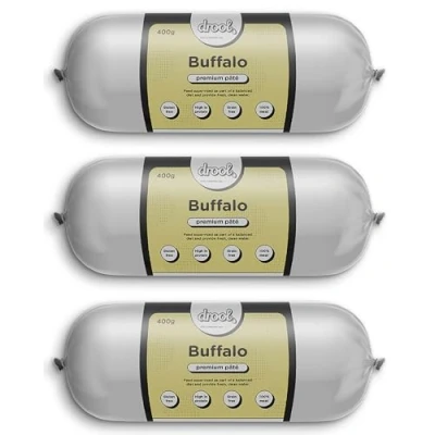 ALL NATURAL: Embrace the goodness of 100% natural ingredients with Drool's Dog Food Pate. Free from additives or artificial flavourings, it's a wholesome choice for your furry friend. FLAVOUR THAT WILL MAKE YOUR DOG DROOL: Buffalo flavour that dogs love, making it an excellent choice for training or as a high-reward treat. PURE PROTEIN, NO GRAINS: Packed with protein and free from grains, this pate ensures your dog gets all the benefits of a high-protein diet without unnecessary fillers. NATURALLY BENEFICIAL: Promotes healthier coats, skin, and joints, supports good digestion, and contributes to improved dental health and breath, thanks to its all-natural formulation. WHAT’S INCLUDED: Each pack contains 3 x 400g of premium pate in buffalo flavour, ideal for dogs of all breeds and life stages.